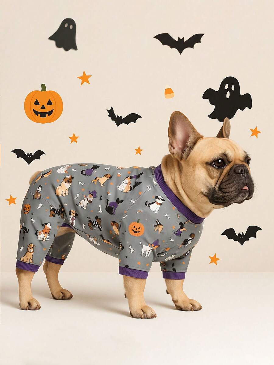 1 Stück süßer Halloween Muster Haustier Pyjama, geeignet für kleine und mittlere Hunde, Jungen und Mädchen, weich und dehnbar, Hundekleidung für Bichon, Yorkshire Terrier und Französische Bulldogge