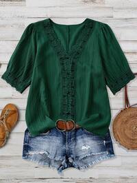 SHEIN Clasi Damen Große Größen einfarbiges simples V-Ausschnitt Rücken gefaltetes Kurzarm Lässig T-Shirt für Ausgehen, Urlaub, Business Lässig im Sommer