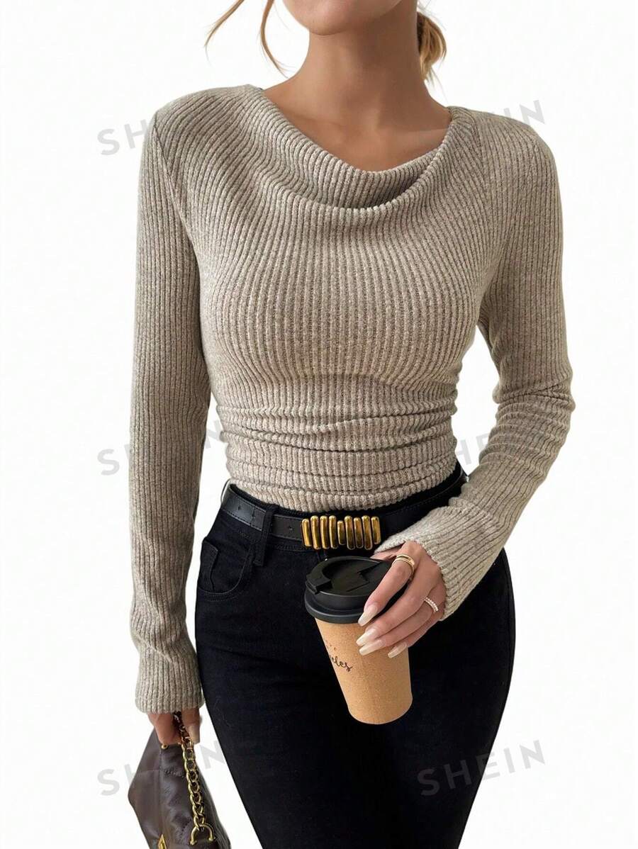 RosyDaze Retro asymmetrisches Rundhals Langarm T-Shirt mit Raffung und Struktur, figurbetonter Schnitt