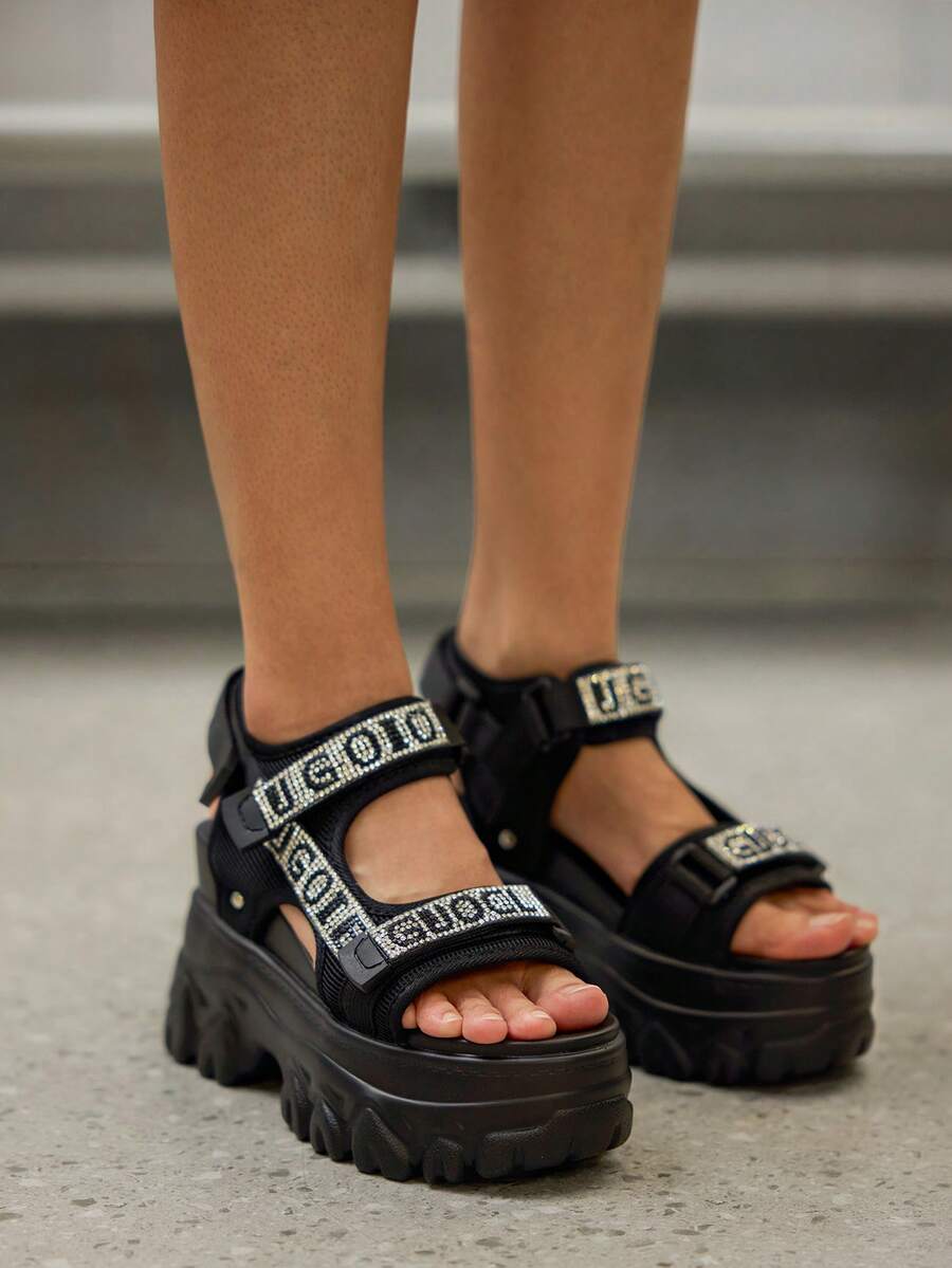 DareSee Sommer neue Mode Strass Damen Plateau High Heel Schwarze Sandalen, atmungsaktiver Mesh-Stoff vielseitig leicht wasserdicht Keilabsatz Offene Zehe Klettverschluss Sandalen Weihnachtsgeschenke