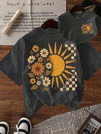 1 Stück Tween Mädchen T-Shirt mit Blumen- und Sonnenmotiv, Kurzarm, Schüler Jugendmode, positive Energie sonniger Sommer Top für Kinder