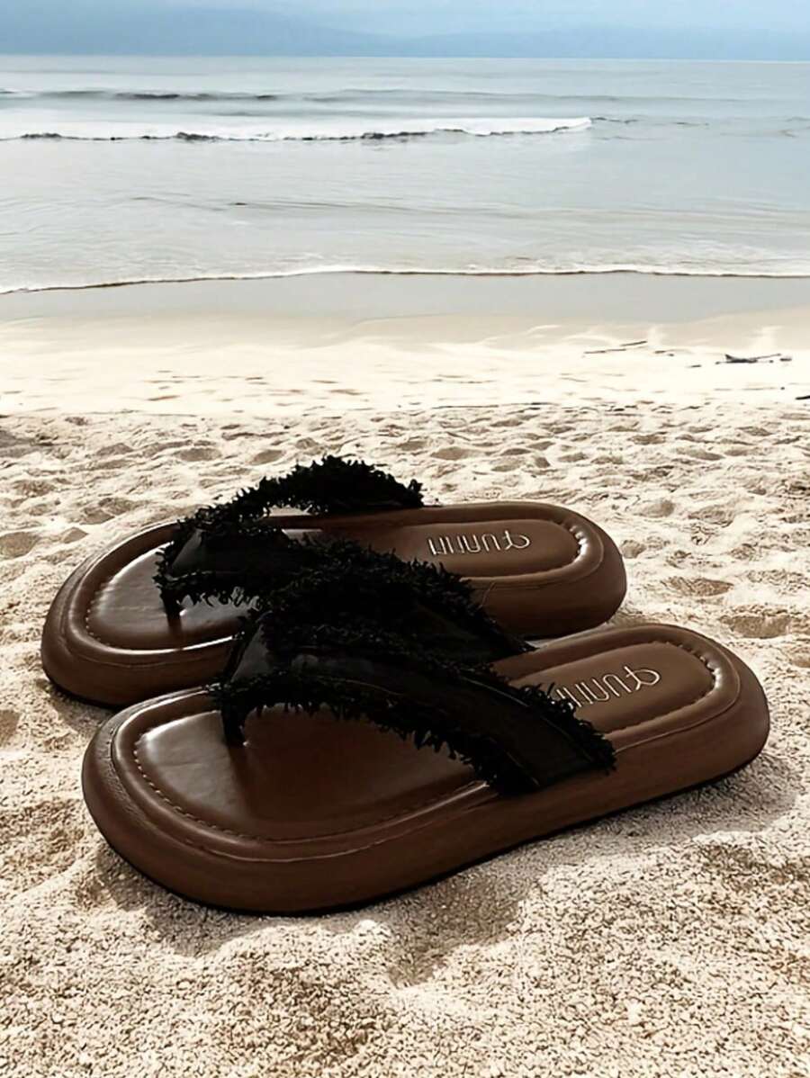 Damen Sommer Flache Slip-On Sandalen - Offene Zehenslipper mit weichem Obermaterial & Gummisohle, gepolsterter Innensohle für lässigen Outdoor-Einsatz, Braun, Strandschuhe, dekorative Quastenakzente