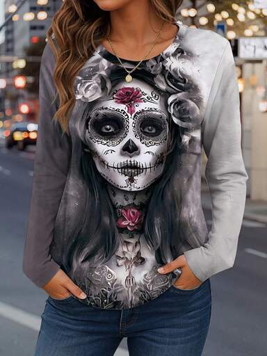 INAWLY Kontrast-Farbdruck mit Skelett-Braut Motiv Rundhals Damen Langarm T-Shirt